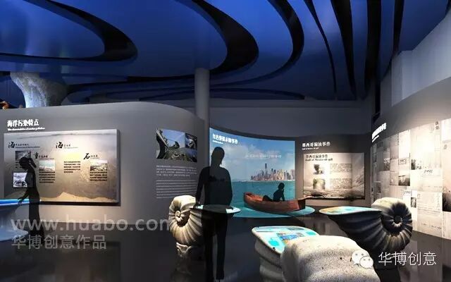 海洋的演化版块,华博创意用穹顶影院与图文墙结合的形式,详细描述海洋演变过程;海洋的馈赠版块,匠心打造体感互动投影,观众可手动捕捉鱼类等海洋生物,在矿物和元素宝库部分,参观者转动转盘指向某一资源,体量柱便可显示资源信息;海洋的保护版块,通过大型触摸互动桌面、FLASH科普短片、环幕与地幕结合的赤潮体验小屋等,使观者参与到海洋环保行动中来。