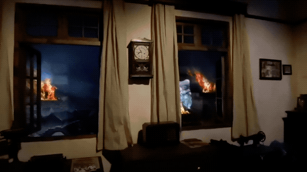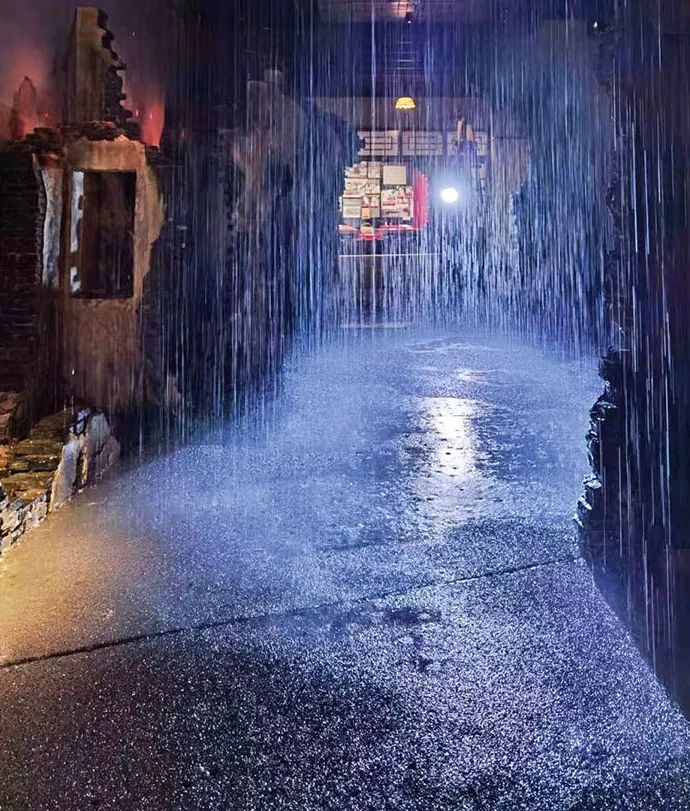其中“淞沪抗战”沉浸式场景有别于以往的展示模式,通过三段式来分别体验城市、乡村战争的激烈与残酷。既让观众在房屋内感受日军飞机在窗外的轰炸、楼板的震动,又有乡村老街雨夜巷战,当走过展厅时雨水会自动避开观众。