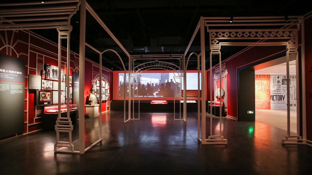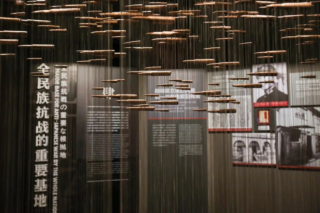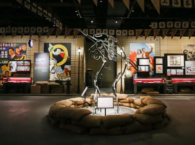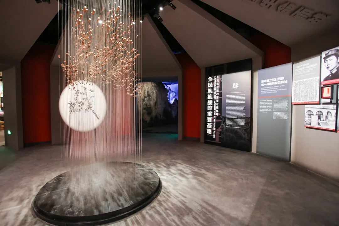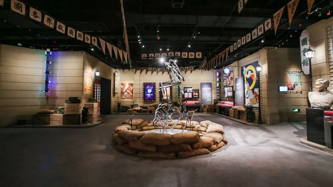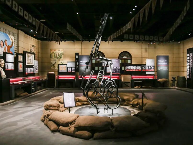 在展陈上,设计团队注重时空转换这一全新的观展体验,将4D科技体验与展陈设计相结合,使参观者的听觉、视觉、触觉、体感与场景还原相结合,仿佛置身电闪雷鸣、大雨滂沱、枪林弹雨的战场氛围;将艺术作品与展陈设计相融合,有利用建筑墙体剥落效果作为浮雕艺术创作的载体、有把多面变幻的雕塑创作加入展品的队伍、更有把抗战中的真枪实弹作为光影成像的作品,表达着“铿锵有力”的誓言,把当前最时尚的艺术表现手段和城市元素融入历史的展陈之中。让观众仿佛回到激烈的战斗中,看到历史的厚重。