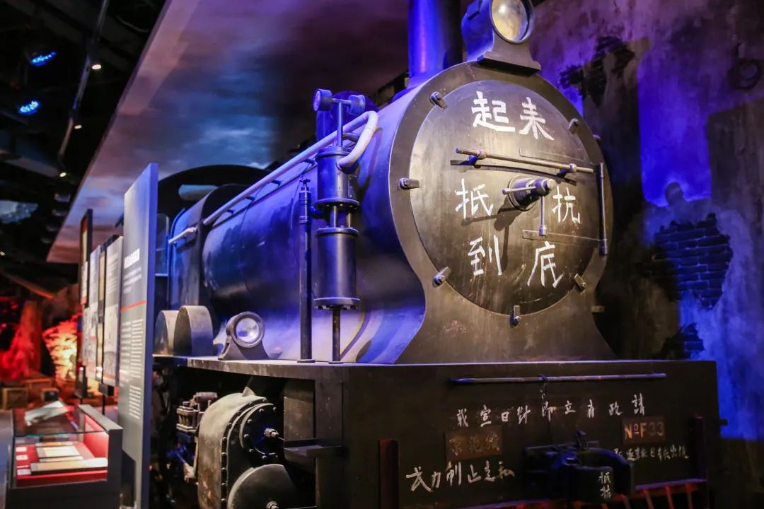 例如将中国第一条商业运营铁路“吴淞铁路(即后来的淞沪铁路)”的模型贯穿展览的第一部分和第二部分,在机车车头“起来抗战到底”的口号,开宗明义地点明了上海作为全国救亡运动中心这一主题。