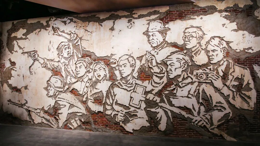 "起来,战!"木刻与上海石库门红墙结合的创意浮雕艺术墙