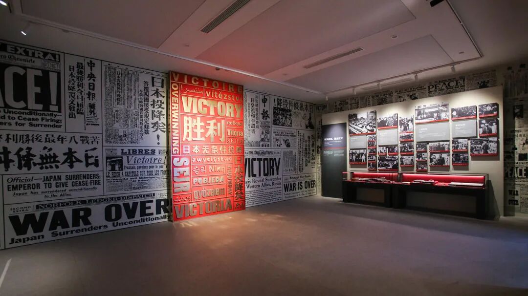 在展厅中运用大量宣传二战胜利的报纸形成展墙及地面,使整个展厅充满胜利的氛围。各个反法西斯联盟国文字组成的胜利,极具视觉冲击力。
