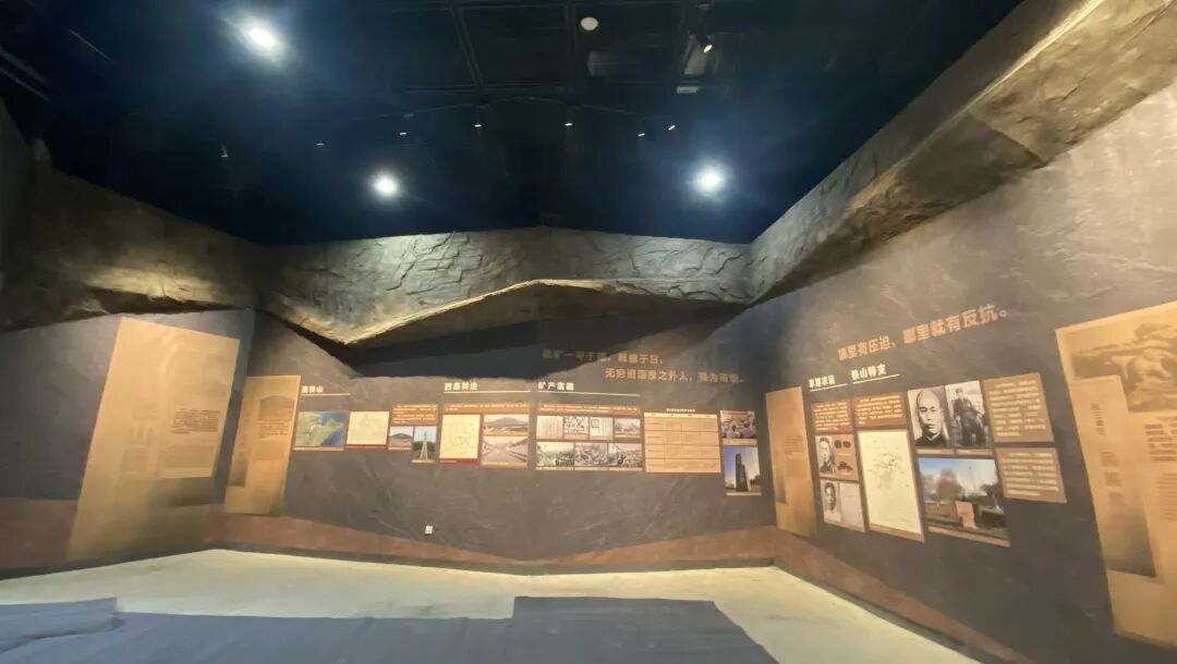第一部分——铁山巍巍,采用独特的飘带艺术造型,以富有黑铁矿石的背景墙搭配富有年代感的造型展墙,给人以强烈的视觉冲击。