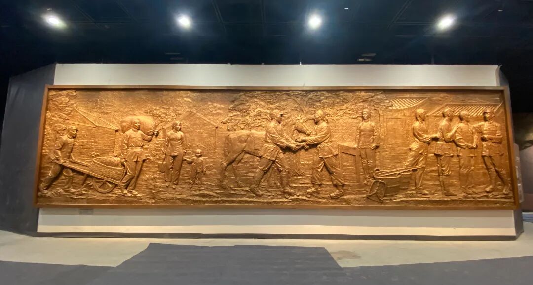 黑铁山抗日武装起义,是山东抗战史上著名的抗日武装起义之一,涌现出了大批可歌可泣的英雄人物,在抗日战争和解放战争中,立下了赫赫战功。结合历史,序厅采用黑铁元素的红色背景,红旗漫卷、党徽吊顶、主题群雕、旗帜飘扬,述说着革命先烈血战到底的英雄气概和坚韧不拔的必胜信念。