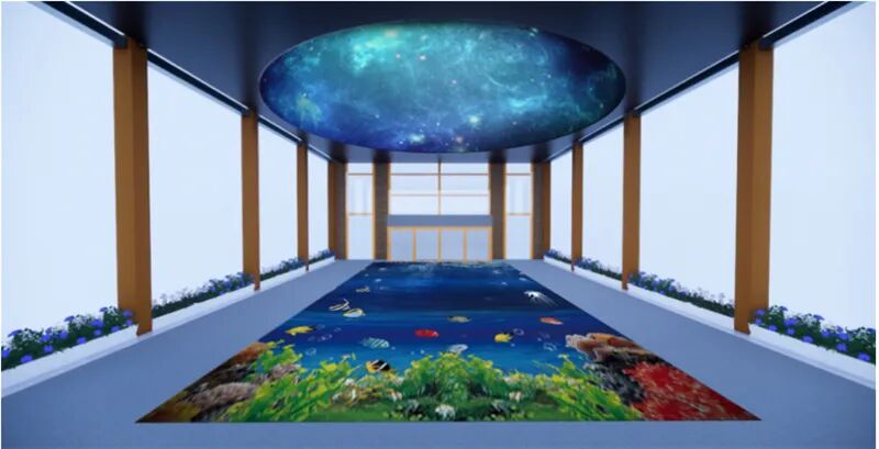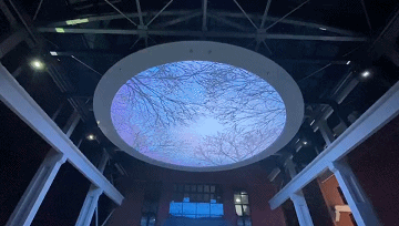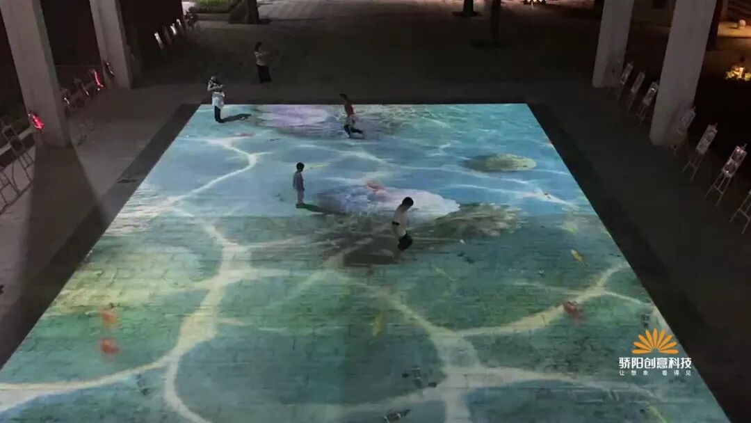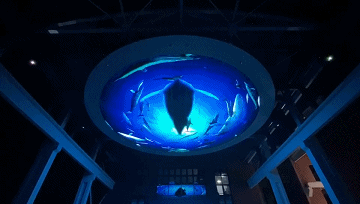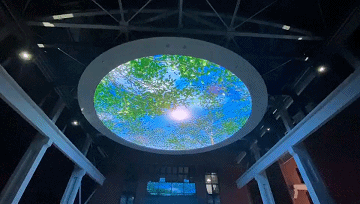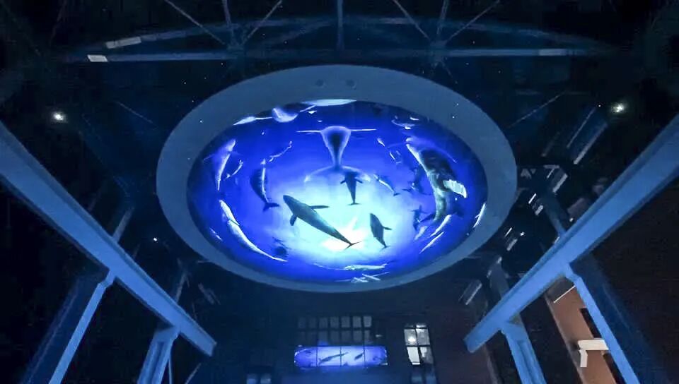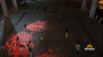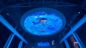 头顶的一片蓝天晕染了煤机蓝几分色调,脚下的一方厚土凝聚了芝麻街几许历史的波澜。天圆地方,源远流长。郑煤机老广场上方的圆形幕墙,直径12米,面积114平方米,色彩丰富,细节入微,是为天幕;下面方形地面互动,采用激光投影+红外动态捕捉感应器的互动融合方案,给人以奇幻动感的交互体验。屏幕显示内容分别为春、夏、秋、冬,海洋,星空等主题,可谓春夏秋冬,周而复始。星辰大海,永在征途。