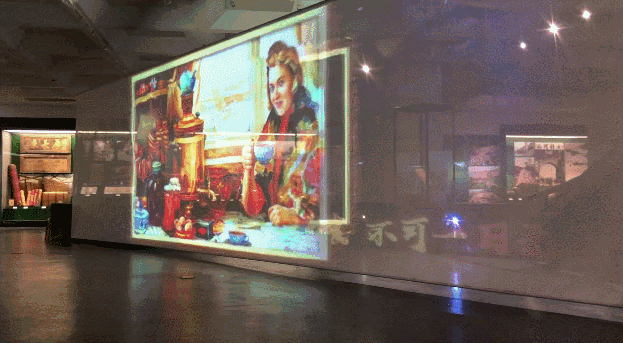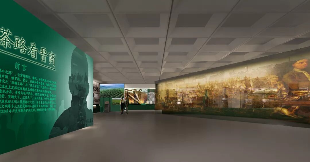 为更好地传递内容,增强展览动感和传播力度,在Y字形展台两侧设计了两幅长14米的巨型纱幕,利用叙事蒙太奇手法制作影片,展示茶路历程和晋商精魂。