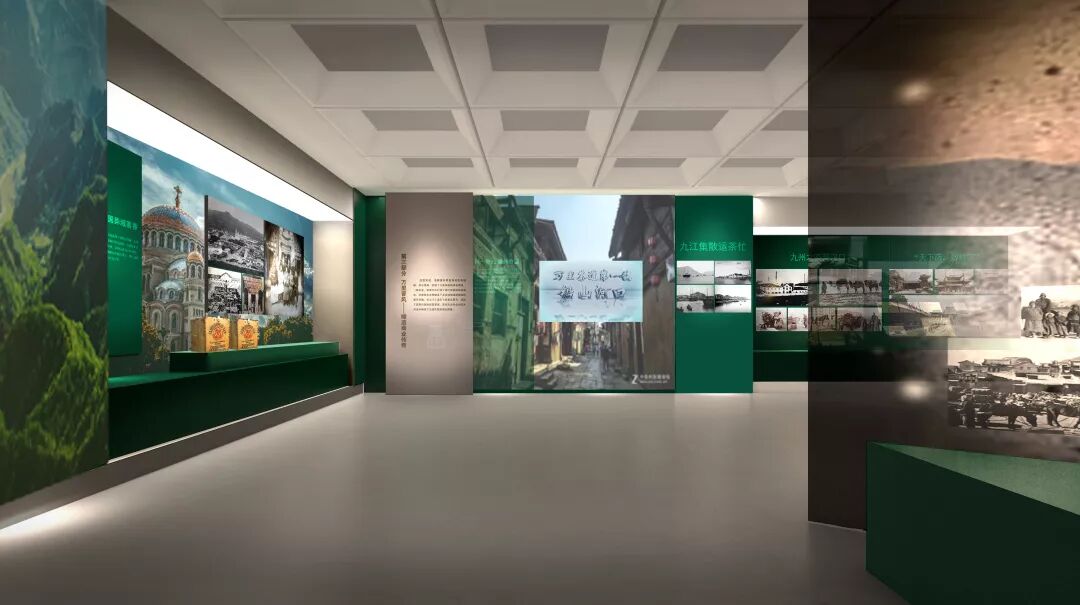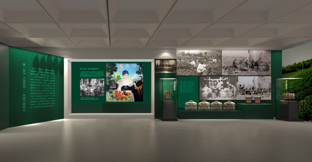 展览主色调取用茶叶初生时呈现的嫩绿色,象征生机和希望。在一片绿意盎然中,观众仿若置身茶园,轻轻一嗅,似有茶香。
