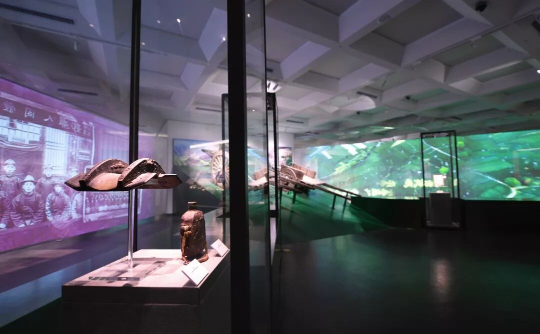 柜内拼接组合大幅历史照片,丰富背景信息;柜外展示茶道、茶山、沿线城镇等大画面,引发观众联想。