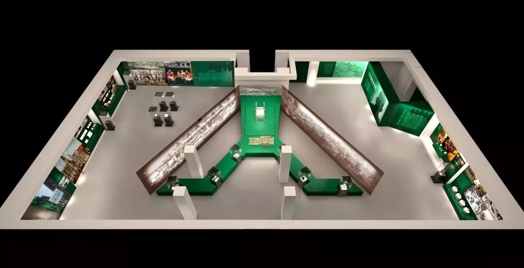 依据内容,整个展示空间依顺时针划分为三大区域:序厅前言区、延墙展示区、中心展台区。