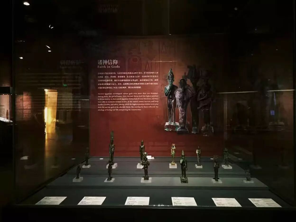 展厅设计以人、法老、众神为主线延伸,分设《多彩的生活》《法老的永生》《众神的守护》三个单元进行展出。其中,以人为主线的展品包括古埃及人日常食用的食品、装饰用的眼影、生活器具、彩釉装饰品等;按照法老为主线的展品包括与法老相关的兵器、木乃伊、亡灵书等;按照神为主线的展品主要包括众神的雕像与动物木乃伊等。