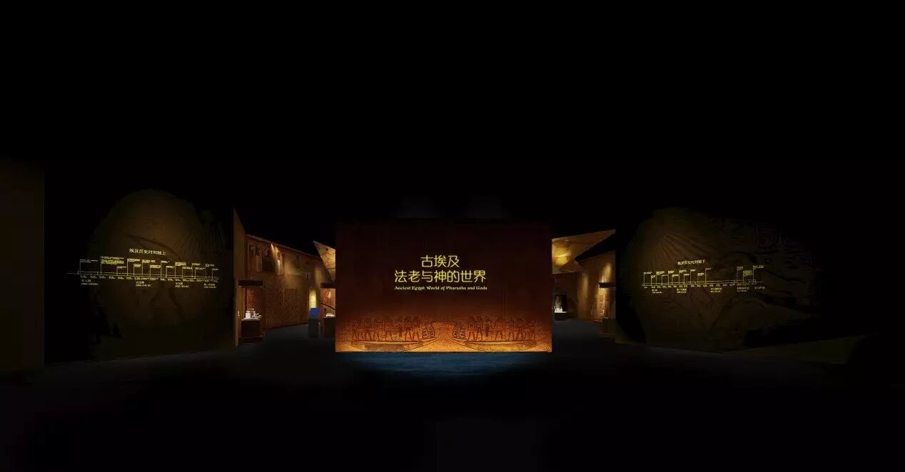 走过尼罗河进入展览内部,用虚实结合的手法营造虚实结合的风格来烘托空间氛围及展示方式。