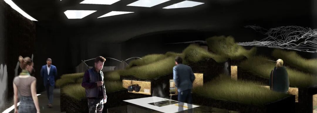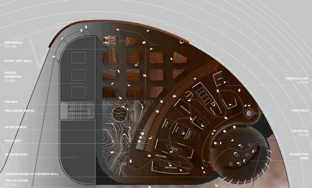 特瑞堡,公元981建于丹麦主岛西兰岛,是斯堪的纳维亚保存最完好的维京城堡之一。本次设计的新体验与知识中心象征着一个“从景观地貌中生长出来”的绿色山丘。内部的展览通过其偏暗的大地色系展示自己“从大地内部一层层切割而出”。展览的内容结合了情感丰富的叙事与实事科学两种方式传递给了参观者。在参观的过程中,观众将探索考古发掘,以及观看三维历史地图并体验维京人的日常生活,随之他们将进入一个180°放映的维京战争电影。最后的空间:一个光室,象征着战争的日后,同时也总结了这个宛如身置电影中的参观体验。