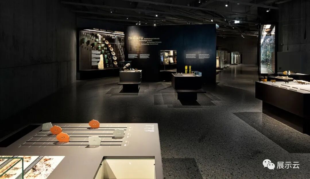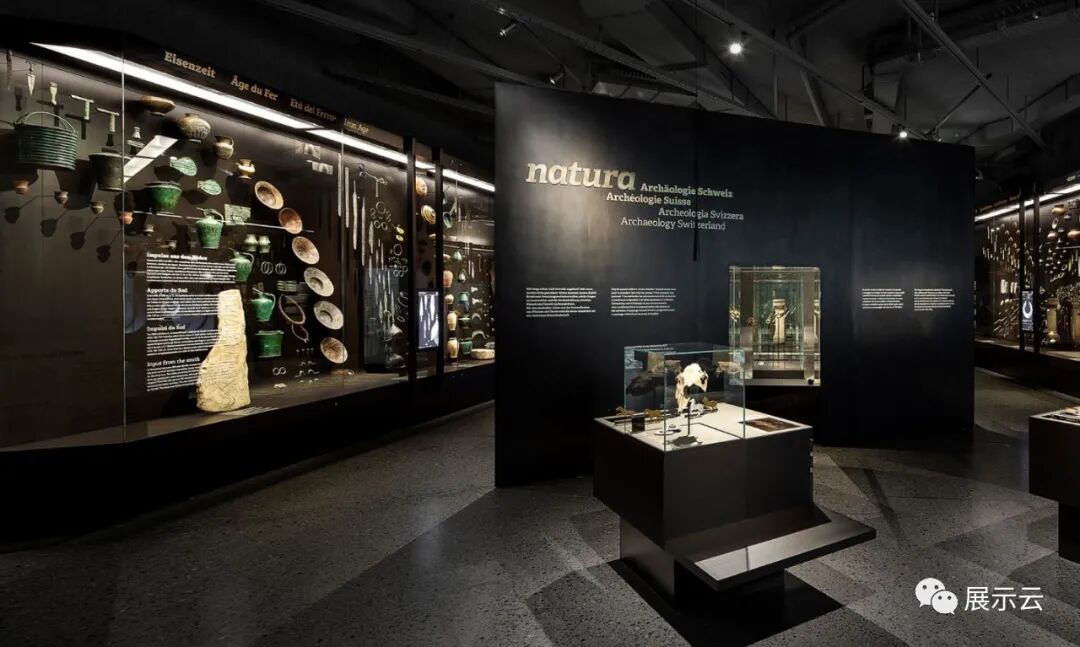 人文,自然,地理:是展览的三大主题,展览主要展示关于赫尔维蒂人考古研究中1300个物件。(赫尔维蒂人:公元前1世纪时,主要分布于现今瑞士高原及德国西南部的一支凯尔特民族部落)。展览的中央展示区“人文”部分,展示了长达十万年之间,人类历史从旧石器时代到中世纪早期的文物。通过大量文化的展示,该时代活灵活现的展示在观众面前。“自然”阐述了大自然对人类的影响,以及人类与环境之间的相互作用。大型生动的动画展示设计直接将瑞士的自然风光领入博物馆里。在游览参观的同时,通过自然历史文化的交互设计以及多媒体交互中心,游览者可以再次领略到同样的风景。“地理”展览中,展示了关于展示文物的具体地理位置参考。一个由3000多个零件组成的铝质金属地质模型悬挂在展厅的顶部,高低不一,让游客仿佛漫步徘徊于瑞士美好秀丽的风光之中。通过灯光的照射效果,这个金属地质模型,形成了光与影的舞蹈,让游客在这时光遂道里尽情感受着来自远古的生活和诗意。