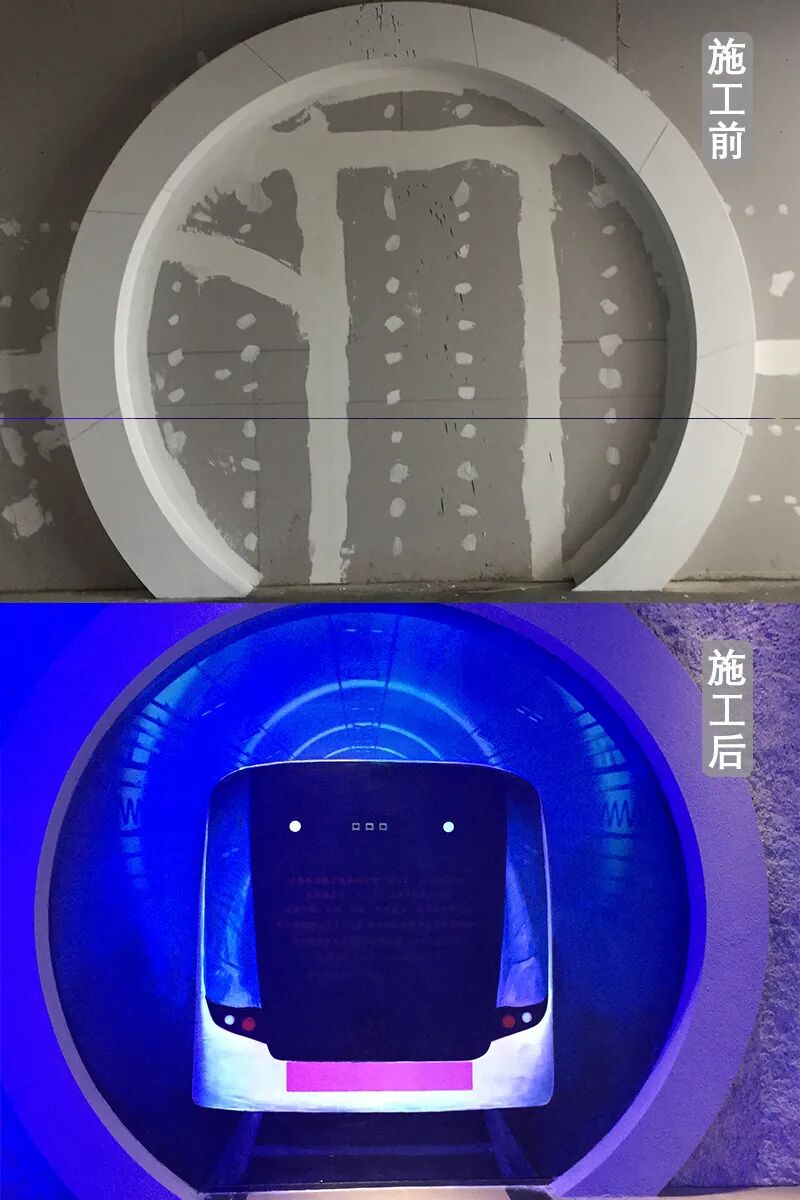 经过无数次的计算、尝试,终于达到了励维想要的效果:盾构机模型一半在墙内一半露出,还带有自转装置,4D效果栩栩如生。