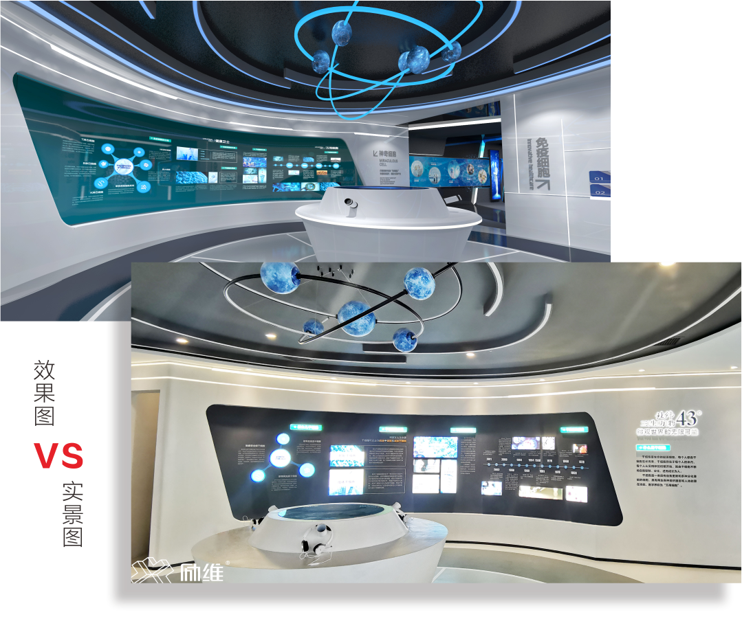 空间线:展厅第二部分由一条时空隧道和环形区域构成。观者先是通过机械滑屏了解各个年龄阶段(婴幼儿、少年、中年、老年) 需注意的健康常识和需养成的健康习惯。随后来到了互动体验装置旁,观者以科研专家的身份在微观世界中观看干细胞和免疫细胞的生存环境、组织和运动状态。环绕旁边的图文墙则介绍了干细胞和免疫细胞的起源、分类、用途与作用。