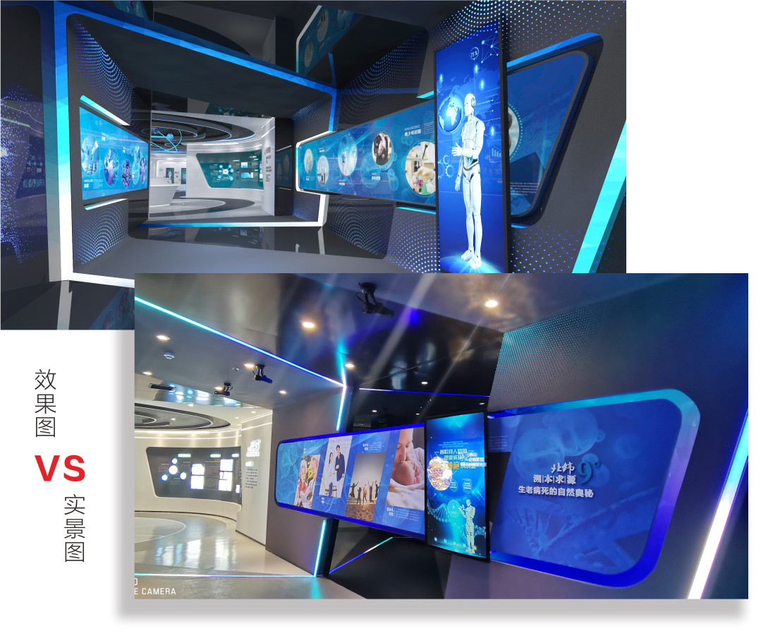 空间线:观者可通过人脸识别,自动扫描上传个人面部图像,通过手势动作,抚平脸部皱纹,感受再生医学奇迹,同时还可在此留下对未来医学的畅想;文化长廊部分则再次强调了南华生物公司打造细胞行业的 “航母舰队”的目标愿景。