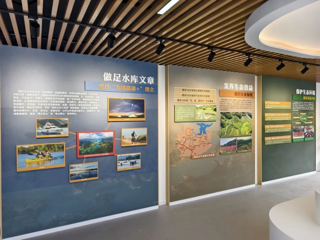 溪口村位于泗桥乡,是泗桥乡牢记嘱托,践行“三库+碳库”重要理念的生动注脚。第四展厅位于二楼,分为“保护生态环境 建设美丽乡村”“发挥生态效益 践行大食物观”“做足水库文章 坚持‘全域旅游’理念”三个部分,展示泗桥乡坚持“生态为基、治理为要、项目为王、产业为核、文旅为翼”的发展路径,奋力建设宜居宜业宜游的和美新泗桥的积极作为。