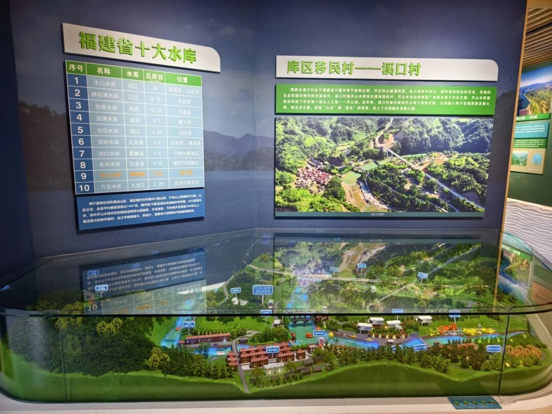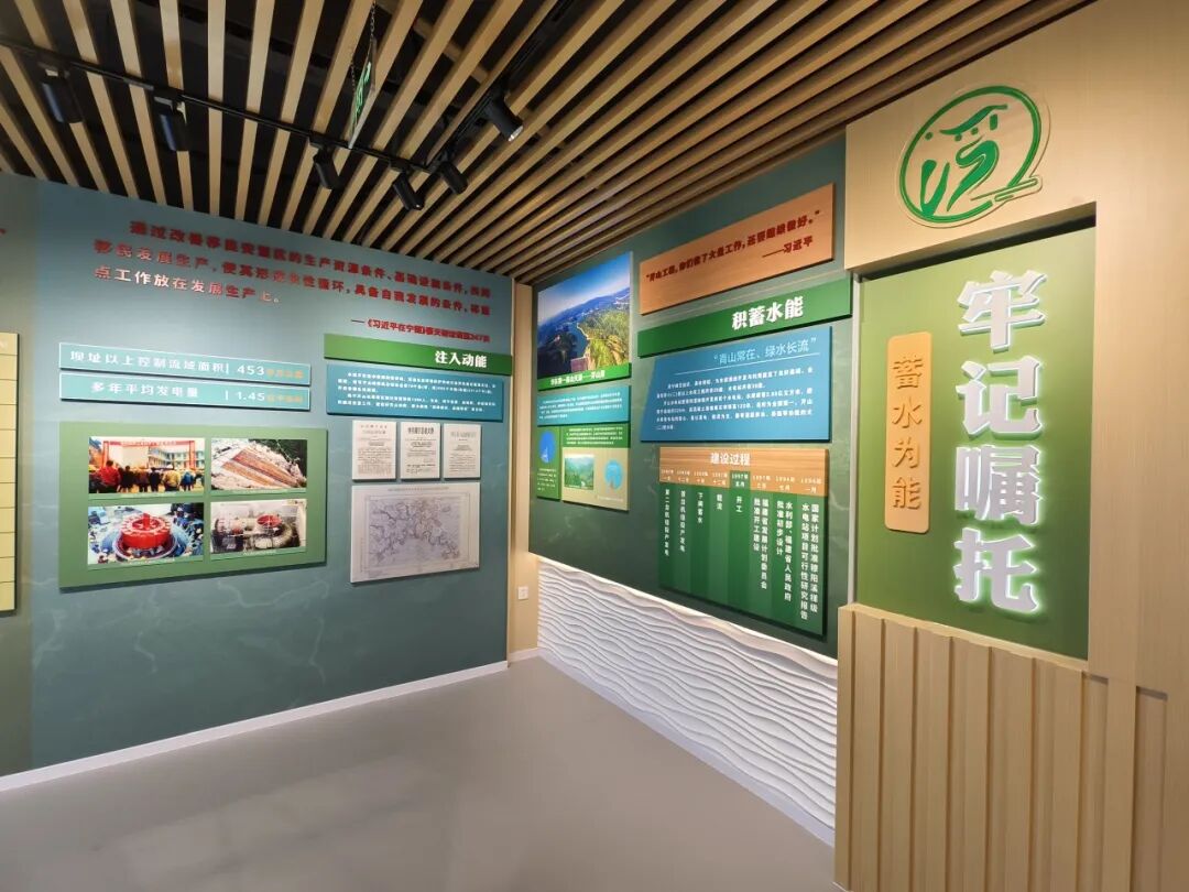 第二展厅分为积蓄水能、注入动能两个部分,展示周宁县牢记嘱托,积极建设芹山水电站,以及芹山水库为当地带来的经济效益、生态效益和社会效益等。