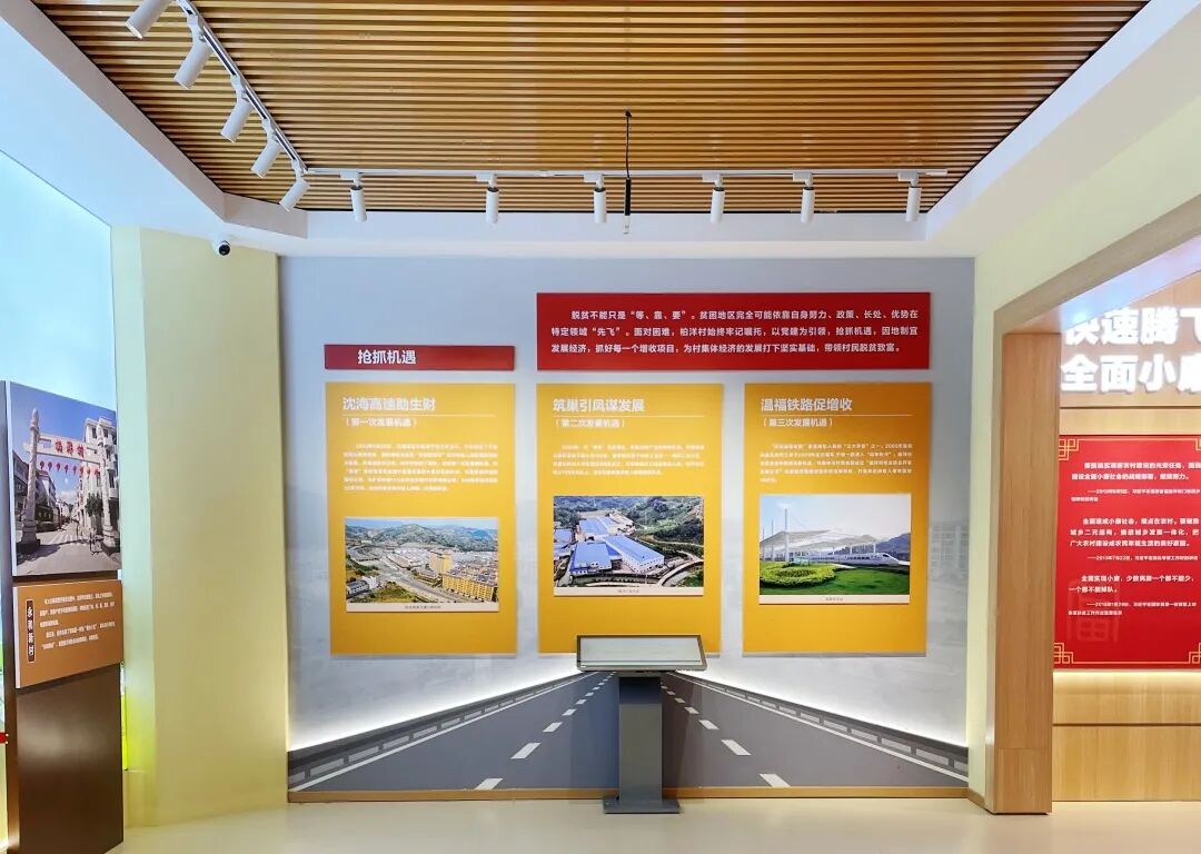 第一展厅以期盼发展、筑强堡垒、抢抓机遇三个单元,为大家展现典型赤贫村柏洋弱鸟先飞、摆脱贫困的奋斗历程。