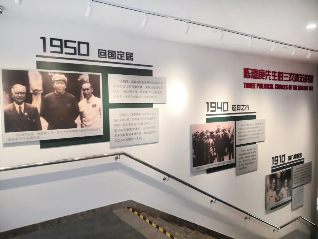 一楼通往二楼楼梯右侧展示的是陈嘉庚先生的三次政治抉择。纵观陈嘉庚先生三次政治抉择,无不体现出他对国家前途的深切关注、对民族命运的深切关注,他每一次的抉择,念兹在兹的始终是爱国、希望国家富强,始终是民族大义、期待民族复兴。