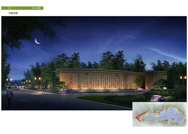 竹博园风景区分为“主入口区”、“大竹海区”、“民宿区”“珍品园区”、“园竹景石区”、“水上森林区”,并通过“音韵竹声、竹之隐、竹之禅”设计构想贯穿整个景区,通过“凤鸣竹舞、竹海寻音、云栖竹径”等设计手法,通过片植国内外主要松竹类植物展现当地独特风采。