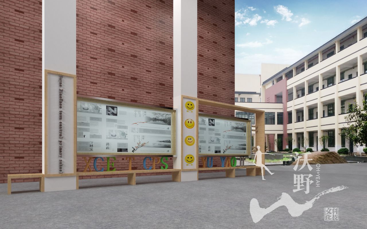 宣传窗设计中运用余姚小曹娥镇中心小学的英文翻译与拼音做点缀,将座椅与宣传窗整体设计,观看信息的同时也为师生提供休憩与等待的基础设施。