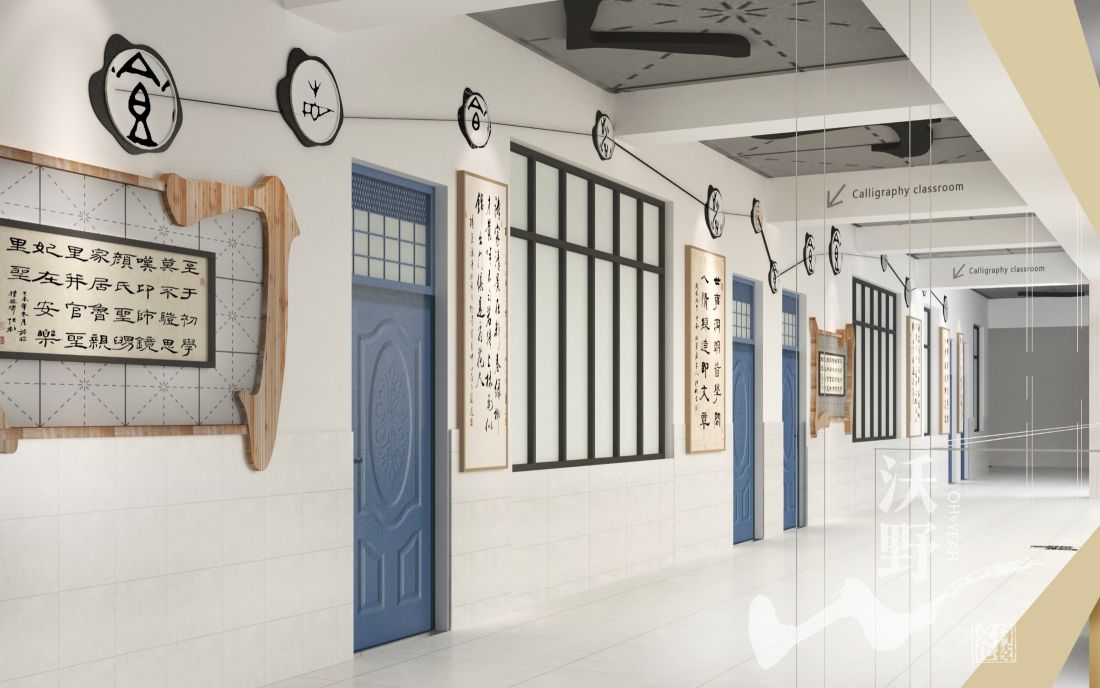 书法教室走廊提取书法中笔顺与墨点元素,笔顺化为展板,墨点连接勾勒喷墨画作,顶面同时运用了笔顺,书法漂浮于空中,也深深埋藏在心里,学习认知书法,发扬书法精神。