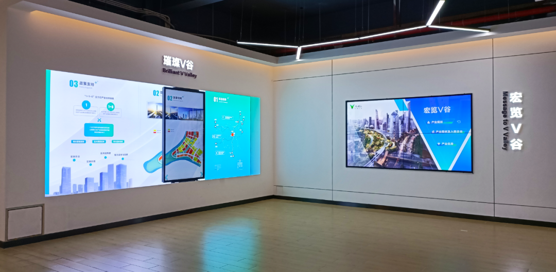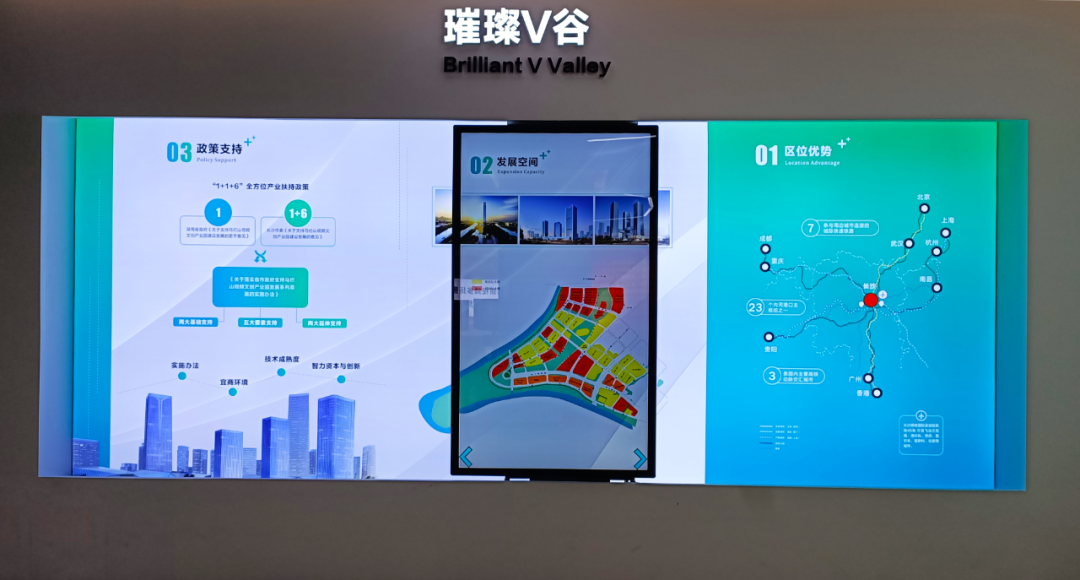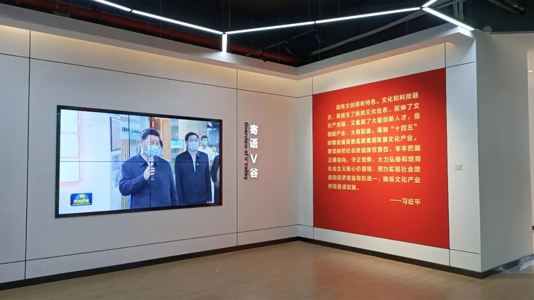“寄语V谷” 版块以展墙结合DID拼接大屏进行展示,展墙上铭记着总书记对马栏山文化产业发展的殷切希望,大屏内容则呈现总书记、各级领导关心支持 “中国V谷” 建设发展的新闻动态。