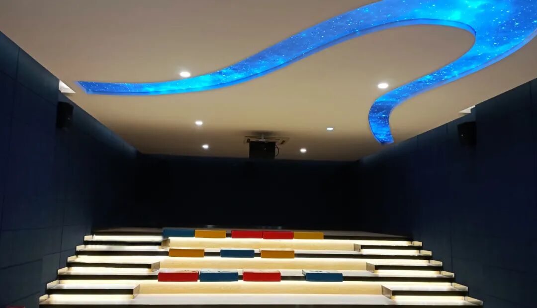 步入多功能影院,天花板的蓝色浏阳河呼应 “中国V谷” 之美称,简约不失活泼的阶梯设计适用于不同场景的观演需求。走出影院,观众可通过计算机进行人脸识别,生成仿西方油画大师风格的个性画像,以此留作纪念,结束本次参观。
