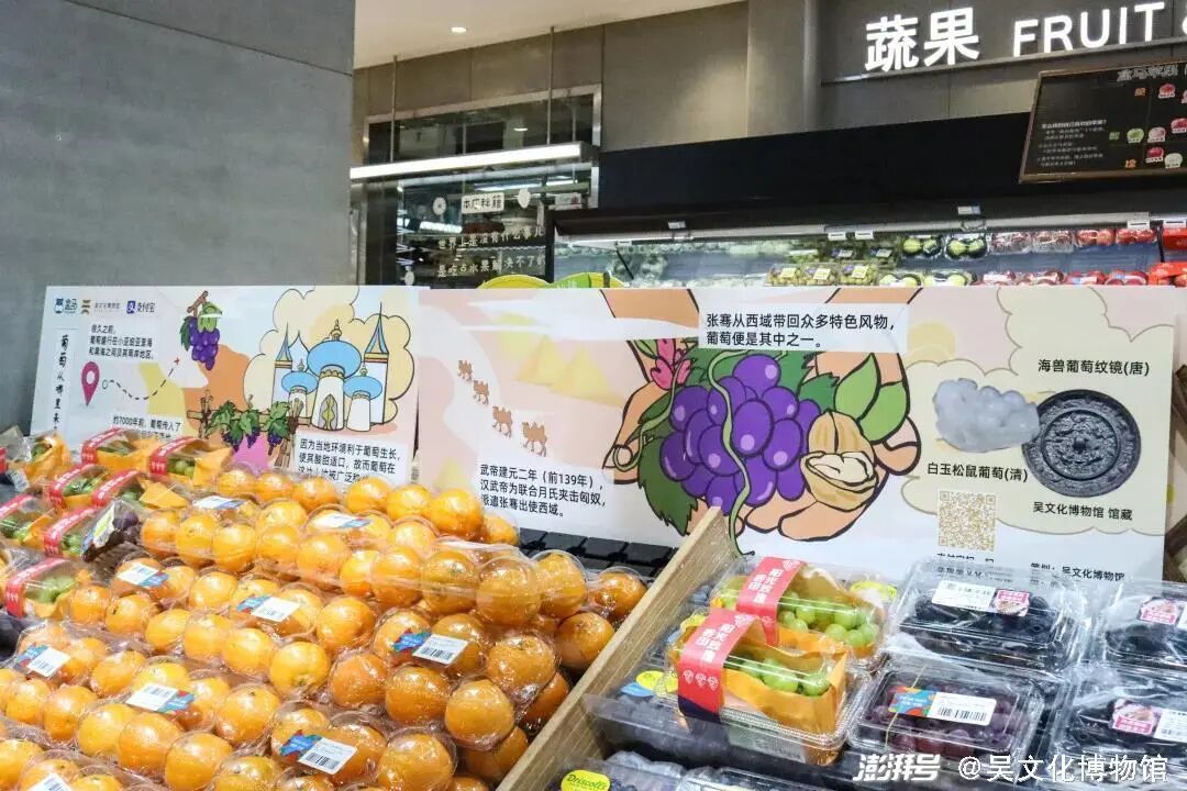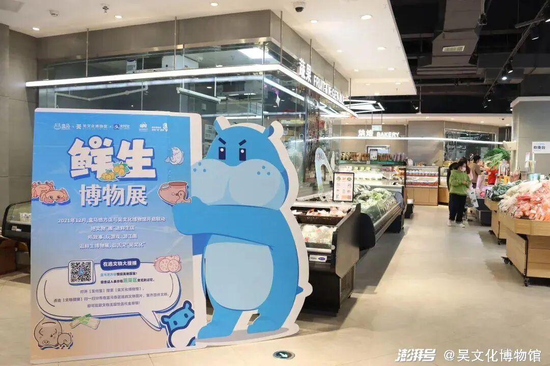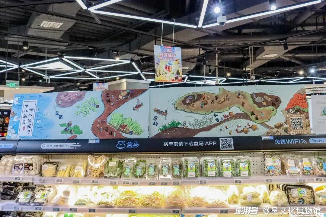 2021年12月,苏州吴文化博物馆与苏州盒马及支付宝联动,策展上线了“鲜生博物展”,在生鲜店内植入了吴地风物标签,阐释生鲜产品文化信息,展示博物馆藏的饮食文化相关文物,联合生鲜店开发文创食品,运用AR技术实现探店寻宝,打通线上展览和线下购物,将博物馆“搬进”了生鲜店。除了拉动博物馆的日常流量,让不看展的观众经由生鲜店,也走进博物馆,更为线下的商业空间赋能,为生鲜店注入了灵魂。