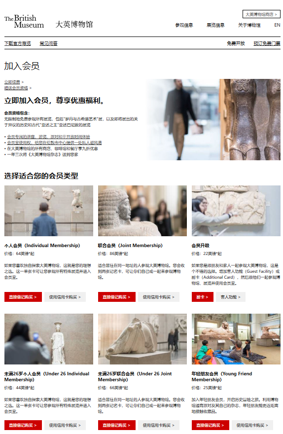 大英博物馆的会员体系分为个人、联合、未满 26 岁等不同类型,价格从 44 英镑到 86 英镑不等。权益包括无限次免费参观特展、会员专属活动、会员室使用权、商店和餐饮折扣,还有杂志订阅。