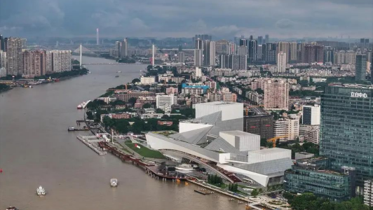从高处俯瞰,白鹅潭大湾区艺术中心三馆连成一体,高低错落、层次分明;从江岸向后,建筑逐渐由低到高叠级而上,形似一艘即将出海的白色“巨轮”,寓意“岭南文化乘风破浪、远播四海”。