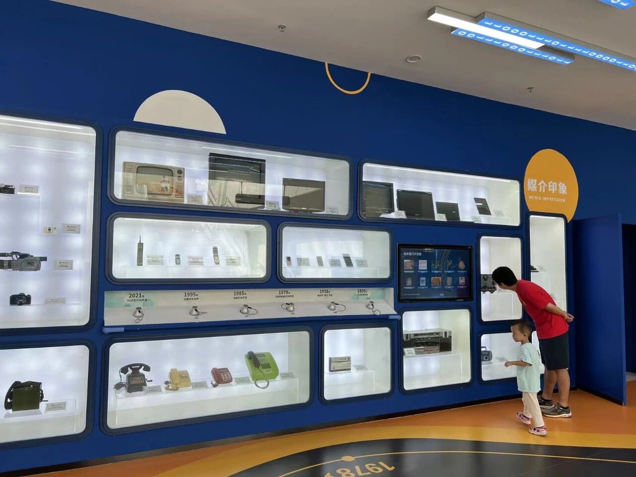 通过展示不同年代的各种信息媒介的代表性设备,如BB机、磁带、大哥大、电视、电脑、手机等,搭配年代感鲜明的媒介声音,让参观者直观地感受人类信息传播技术的变迁。