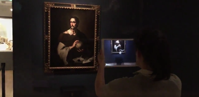 古典的人物在屏幕中呈现出当下日常生活的状态,凡戴克笔下的贵族吃起了速食罐头、传奇女神 Marchesa Luisa Casat 举起手机与观众玩起了自拍,低头阅读的男子手捧星巴克咖啡、头戴耳机摇头晃脑起来。这一有趣的增强现实体验,将古典人物带进现实场景。