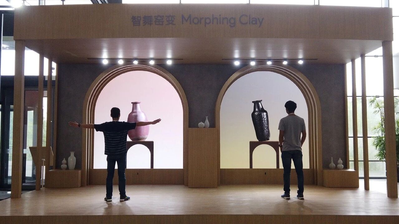 在观众进行互动时,观众的姿势和衣服会映射在屏幕上陶瓷的形状和纹理中,进行无尽的演绎和再现。