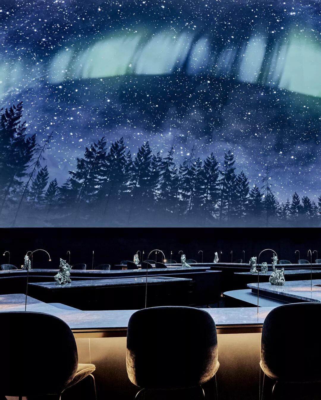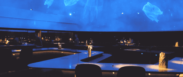 最近,哥本哈根新开业了一家沉浸式餐厅:Alchemist Restaurant,由伦敦设计事务所Studio Duncalf设计完成。一进入餐厅,就会被眼前的景色所惊叹,天花板上悬挂着四米长的黄铜吊灯,不规则形状的餐吧台环绕着空间,拱形的吊顶上配置了投影设备,让来此体验的顾客看到栩栩如生的海底和北极极光场景……