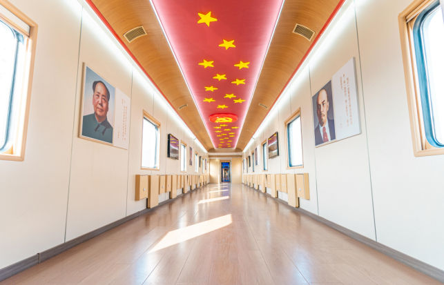 创意来源于“沿着时代的步伐,穿梭过一个时代又一个时代,走向初心的方向”。每一节列车体现一个时代,到一节车厢就像走进了那个时代,沉浸式打造学习氛围。而只有在窄长的列车中,才能完美实现这种“一路向前”。