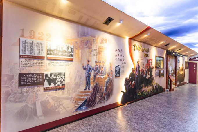 提炼时代元素,融合墙面黑板、窗户、大字报、屋檐等载体,内容与形式达成高度统一,沉浸式学习党史内容。