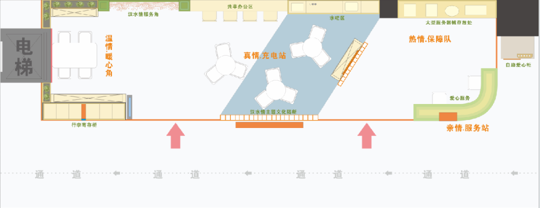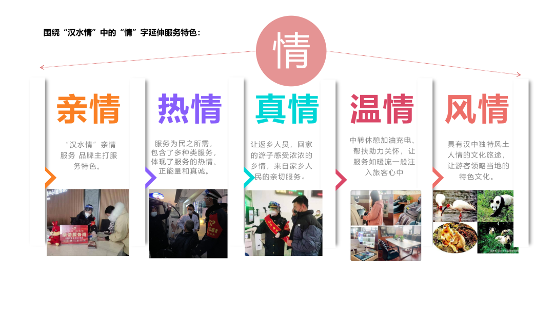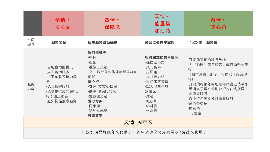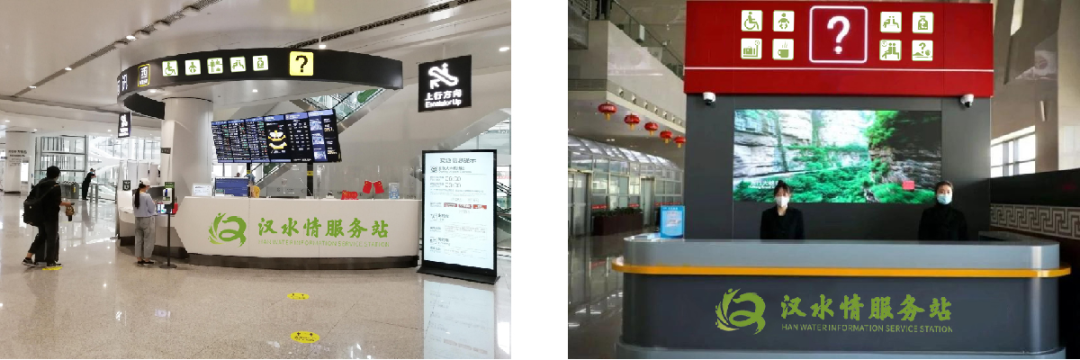 打造开放式服务台,整体体现“汉水情”服务文化体系,融合党建文化、汉中地域文化,设计风格温馨大气,为广大来汉离汉群众服务的亲民,便民窗口,成为车站对外展示的特色服务窗口,加深"汉水情”品牌服务的深度、广度,提升其服务IP知名度,成为一道独特靓丽的风景线。