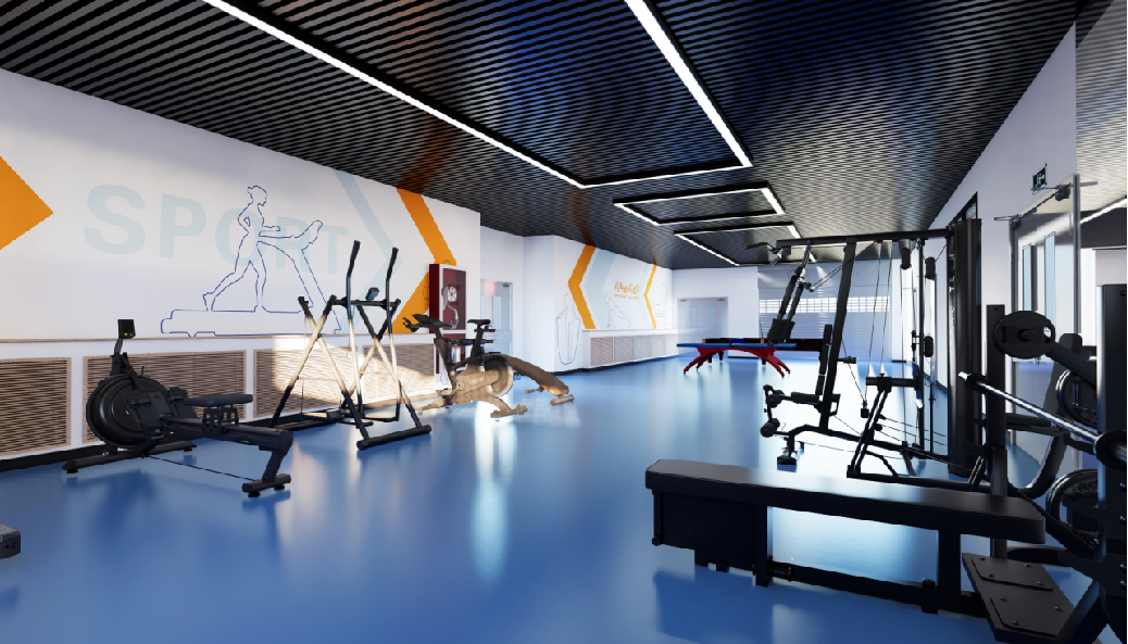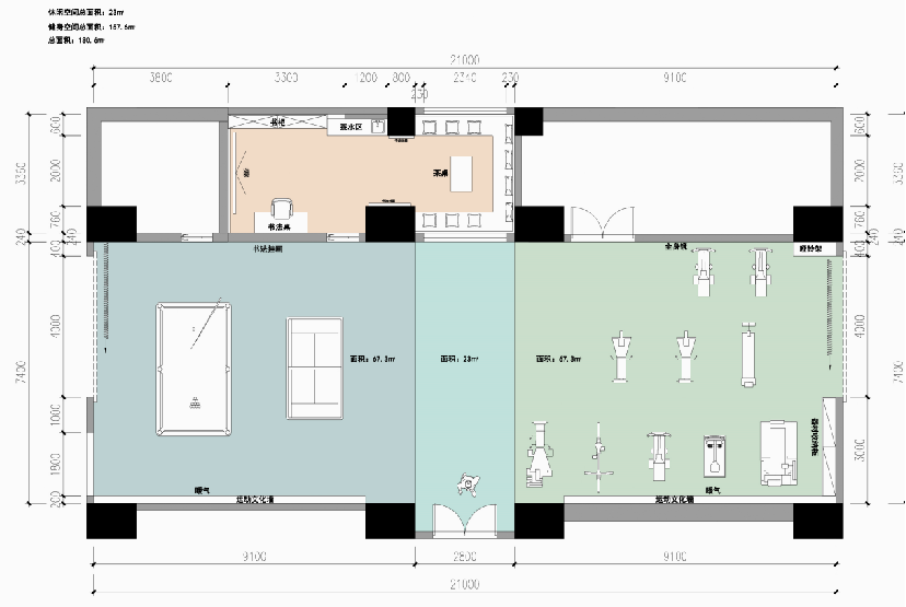 1.大空间:运动区+健身区(全身镜、健身器材、移动收纳架)
