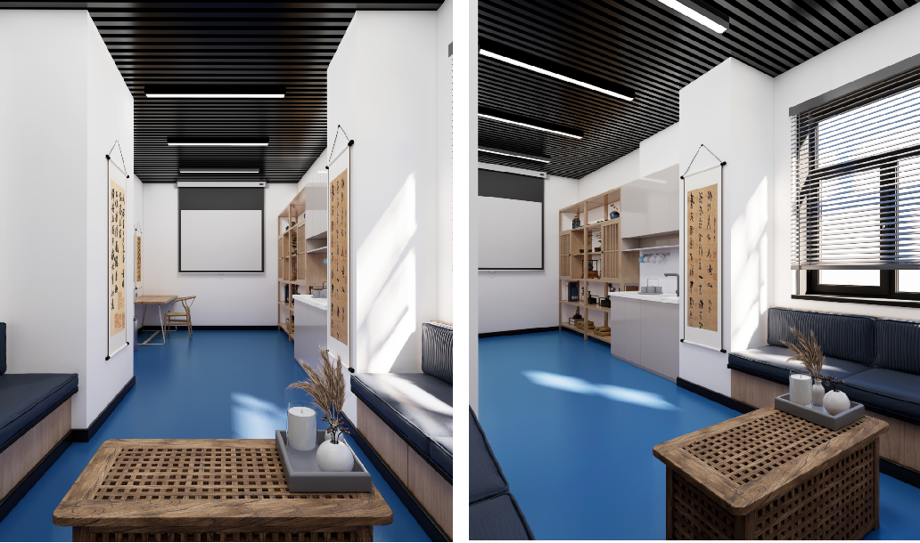2.小空间:休闲区(沙发、书柜、电动投影幕布、茶桌、书法桌)