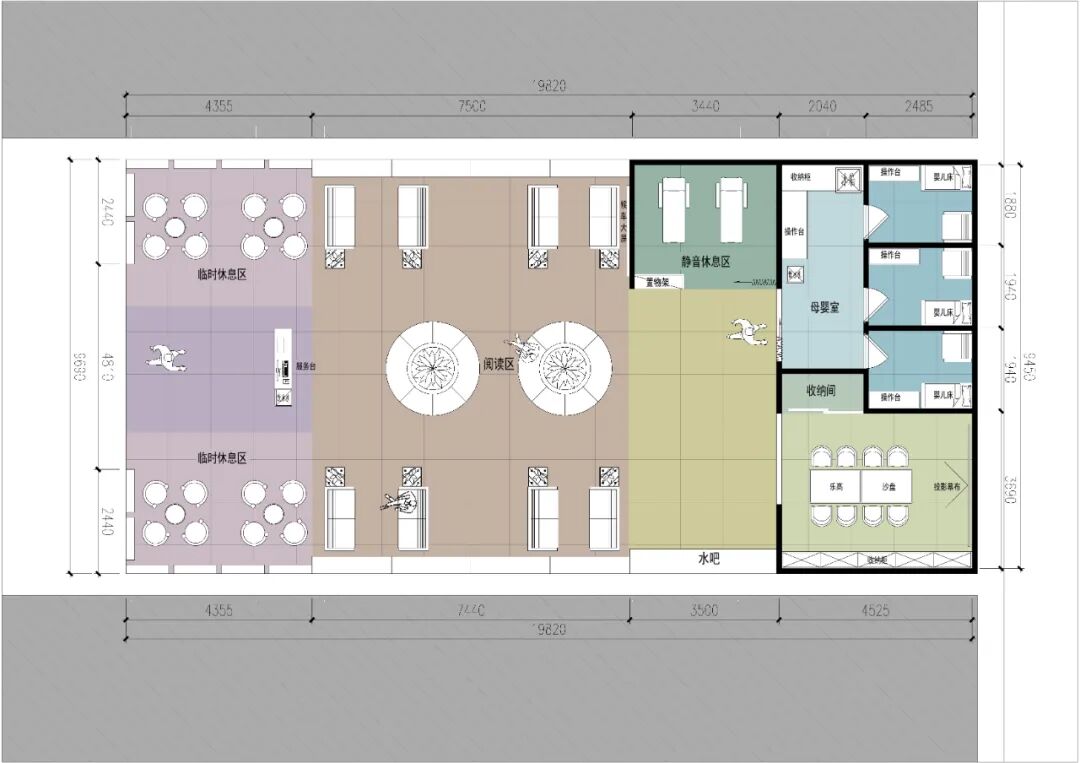 重点旅客候车区是为老年人、残疾人和病人等需要特殊关照的旅客设置。围绕以人为本、“提升旅客体验” 的核心理念进行设计改造优化。空间功能规划为:临时休息区、服务台、阅读区、候车大屏、静音休息区、母婴室。