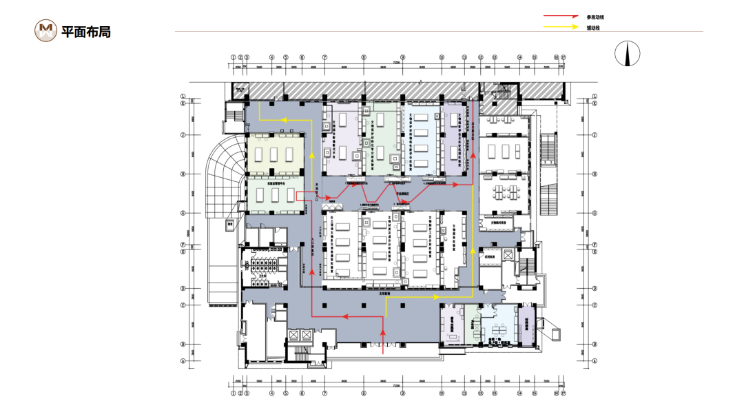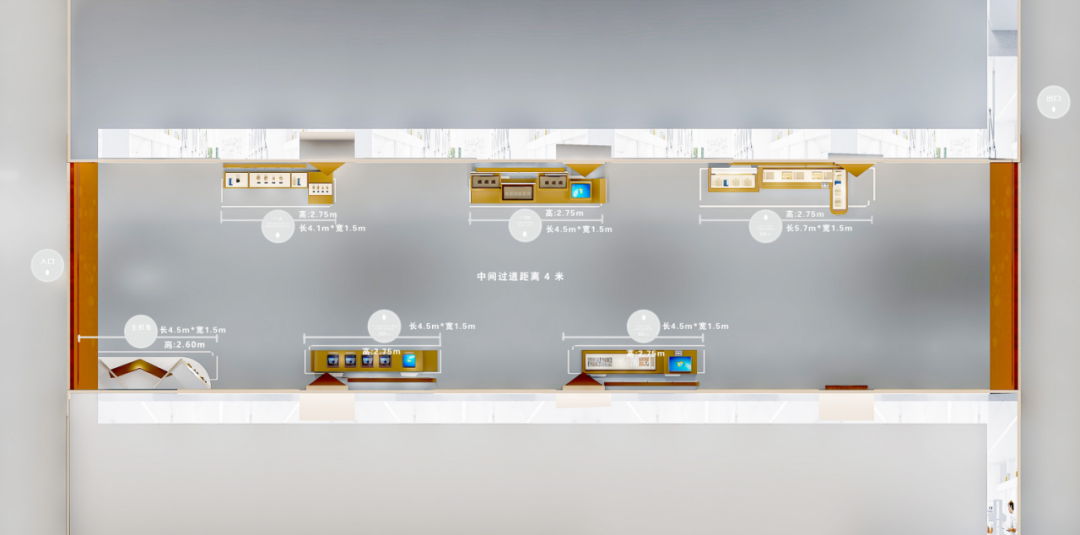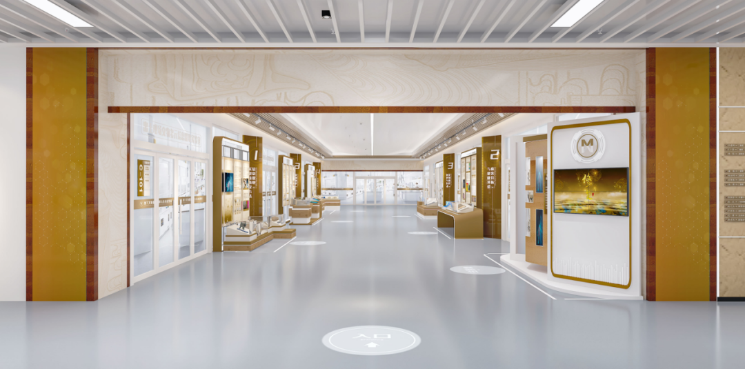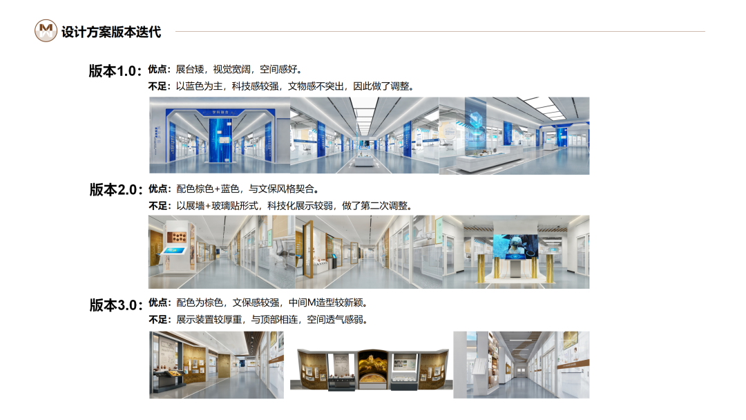 方案3.0进一步深化文保主题表达,中央区域以M造型装置作为视觉焦点,设计巧妙解构学院logo的核心元素,强化专业属性。装置采用全实体结构,厚重且通顶,削弱了开放式展厅应有的通透感与呼吸感。