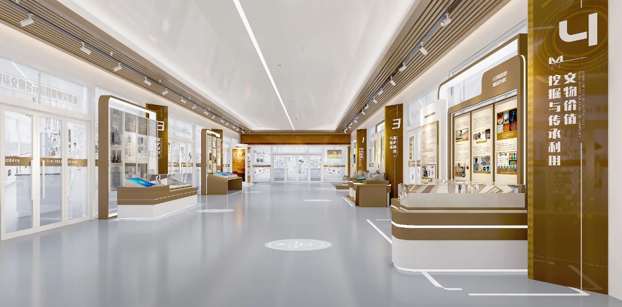 方案2.0色调改为双色搭配,以历史棕(取意地下文物的古朴质感)与科研蓝(呼应学术研究的深邃属性)构建视觉基底。此版设计墙面采用仿夯土纹理的棕色肌理漆,延续了文物保护的历史厚重感,然而,科技化维度展示略显单薄。