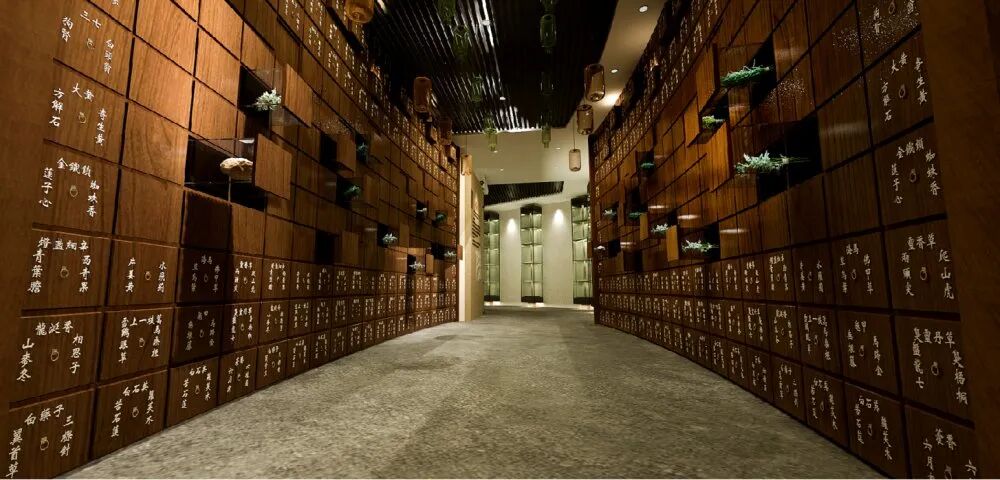 第二展厅的中药展示部分,更是还原中药老店,取名中和堂,寓意中医中正平和的最高境界,再现中药老店的经营模式,前厅有专家坐诊,后厅就有药工据方炮制,抓药。为了更好的展示中药知识,借助建筑空间特点,打造了一面巨幅百子柜造型艺术墙。墙体之上以中药标本、植株标本、互动抽拉式多媒体系统等构成药学展厅独特亮点。该展项使观众在惊叹中感受中国医药文化的博大精深。