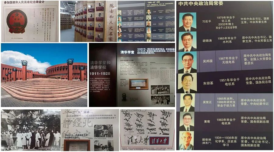 例如清华大学校史馆陈列了非常丰富而翔实的历史资料,从最早期的清华学堂的发展到清华大学的由来,从第一批女入学女生合影、名师介绍;五四运动到一二九的爱国主义革命传统;以及在西南联大时期坚持办学,让清华的优良校风得以发扬等种种事件;更有从清华大学走出的国家领导人、两弹一星功臣和数不胜数的国之栋梁人物介绍等,都反应了清华人爱国、奉献的优良传统和勤奋、求实、创新学风。而清华大学也始终秉承“自强不息、厚德载物”的校训,培养出了大批学术大师、兴业英才、治国人才……这正是清华人学识和精神修养最好的体现。