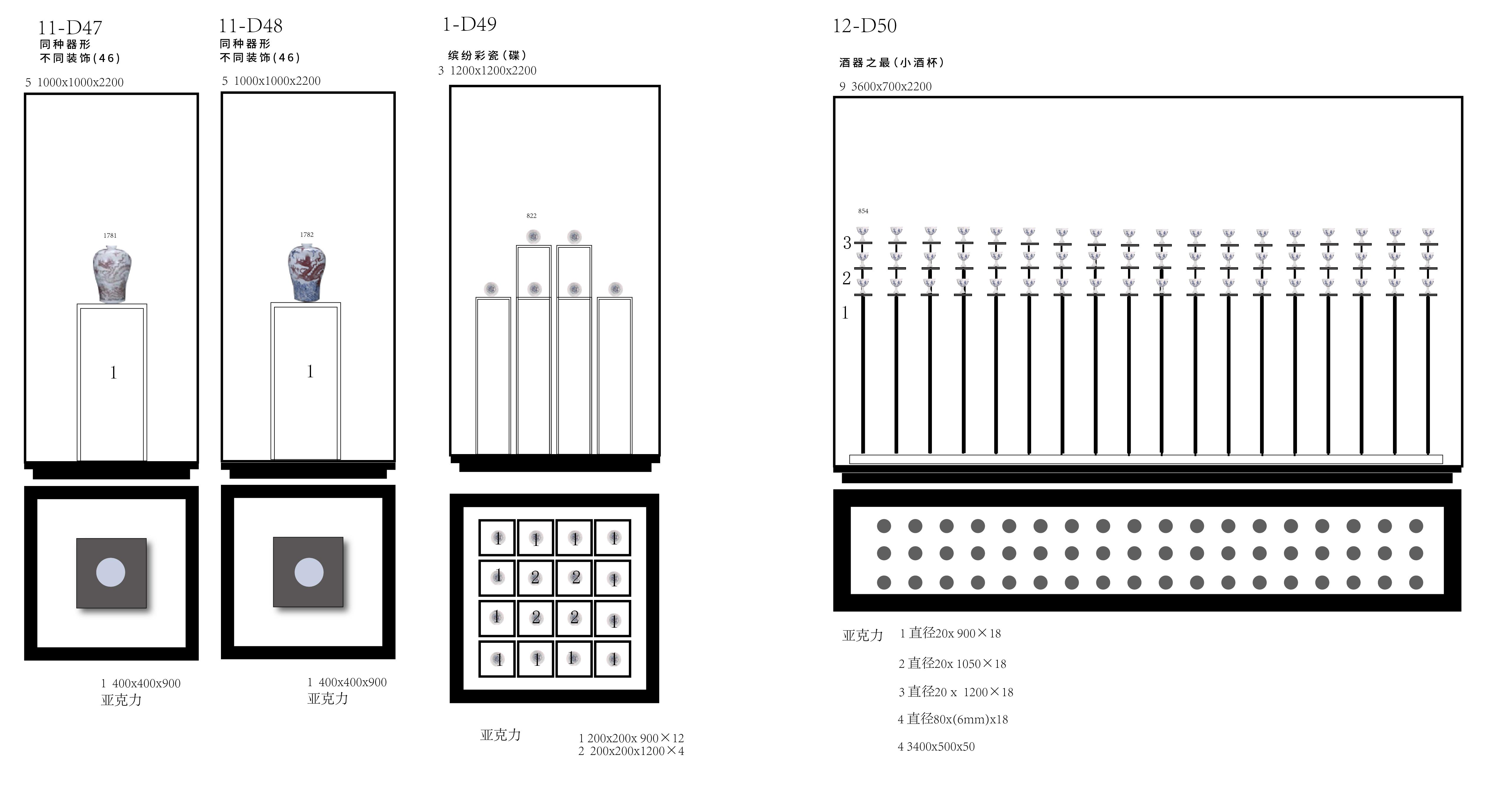 展台、展柜、展板多选用玻璃、树脂等透明材质,令肌理丰富的砖砌墙体得以完整展现,明净澄澈的视觉效果还原了瓷器的本真面貌,同时制造出文物如悬浮于半空的错觉;