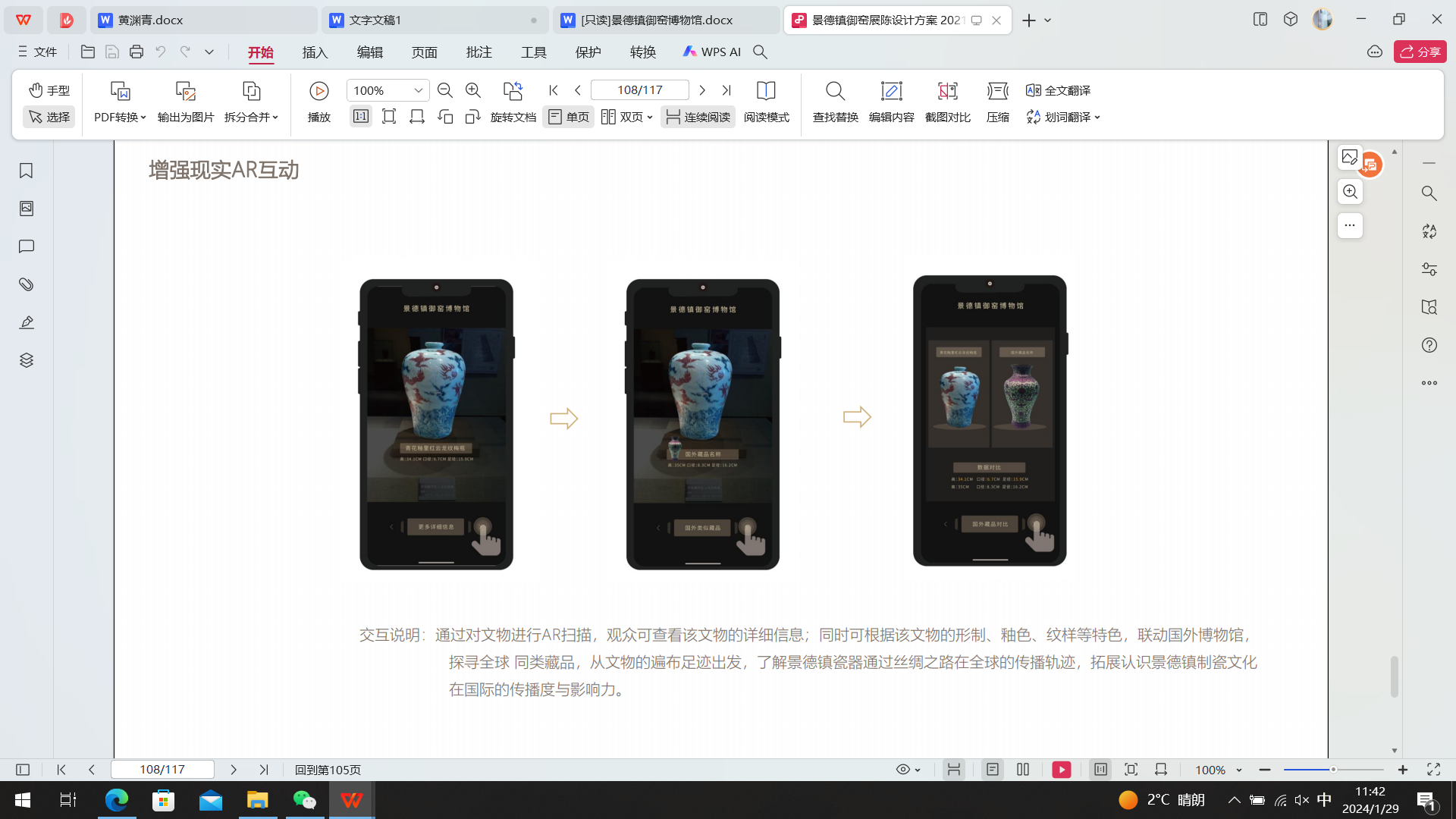 在展柜内放置二维码,可扫码观看相关的文物讲解视频;利用三维成像等技术呈现文物的数字模型,可以放大、缩小,360度观看,并通过触控按键解析详细信息;将文物的静态展示转化为人人皆可参与的动态交互方式,并把音、视频等融入其中;根据相关文物的形制、釉色、纹样等特征,联动国外博物馆,探寻全球同类藏品,了解景德镇瓷器在丝绸之路上的传播轨迹……