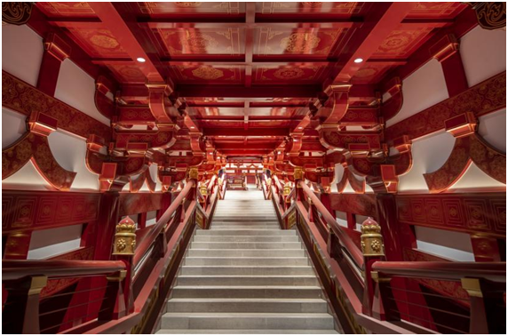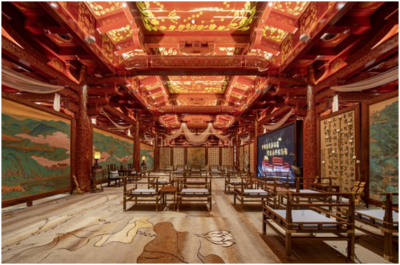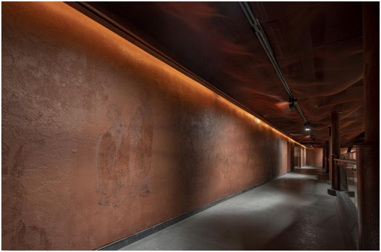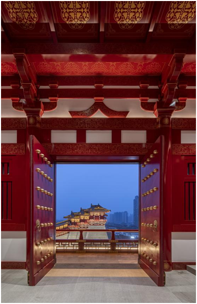 为彰显隋唐洛阳城的皇城风范,应天门遗址内部采用表面细金线仿唐花纹装饰的手法,浓墨重彩地打造出薄铜皮仿木柱、斗拱、门窗和天花,并将建筑木制榫卯结构与内部装饰进行整体设计,在突出历史遗迹特性的同时,营造出符合当代审美趋向的视觉效果。