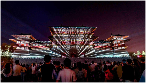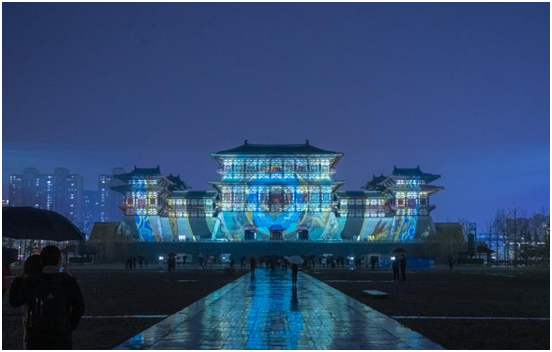 建筑投影秀《寻梦黄河》光影流转,以“起源”,“传承”、“展现”为脉络,在城楼之上串联起九州华夏的恢弘历史。国风音乐机器人科技舞台剧《应天长歌》设计六台机器人和三位真人演员共同配合演出,讲述了墨家传人制造的机甲偶人为武则天合奏“应天长歌”的故事。